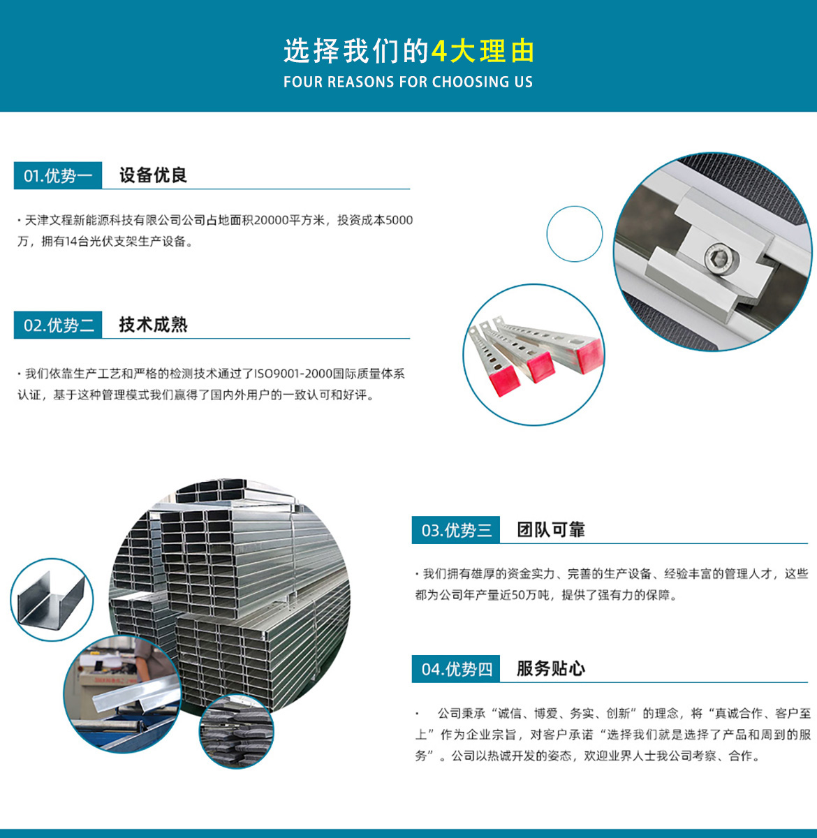 天津文程新能源科技有限公司成立于2021年,是專注于集中式、分布式、漁光互補和農(nóng)光互補等清潔能源發(fā)電的綜合性企業(yè) 公司是集設計、研發(fā)、生產(chǎn)、制造為一體的綜合型企業(yè)。公司占地面積20000平方米,注冊資金5000萬元整。公司坐落于華北鋼鐵重鎮(zhèn)--大邱莊,距天津市區(qū)50公里、鄰104和205國道及京滬高速,交通十分便捷。 本公司擁有三個生產(chǎn)車間,其中兩個冷彎型鋼車間,一個鋅鋁鎂型鋼車間,擁有自動冷彎成型機10條,自動數(shù)控沖孔機10條以及焊接加工等設備。主要生產(chǎn)產(chǎn)品有:太陽能光伏支架、各種規(guī)格的C/Z/U型鋼、抗震支架、管廊支架及整套配件等。